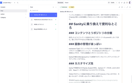 ヘッドレスCMSもいくつかの選択肢がある中で、別件で利用する可能性のあったSanityの使い心地を確認してみたいという思いから今回の変更に至りました。